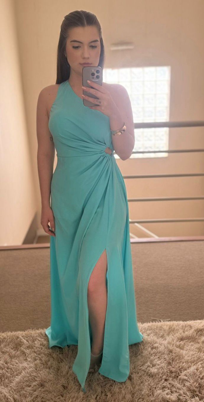 O modelo apresenta decote halter, modelo em um ombro só e um design assimétrico que valoriza os ombros. O destaque fica por conta do drapeado lateral com recorte em argola, que cria um efeito elegante na cintura e realça as curvas de forma sutil e refinada. A fenda frontal adiciona um toque de sensualidade na medida certa, garantindo movimento e fluidez ao caminhar.